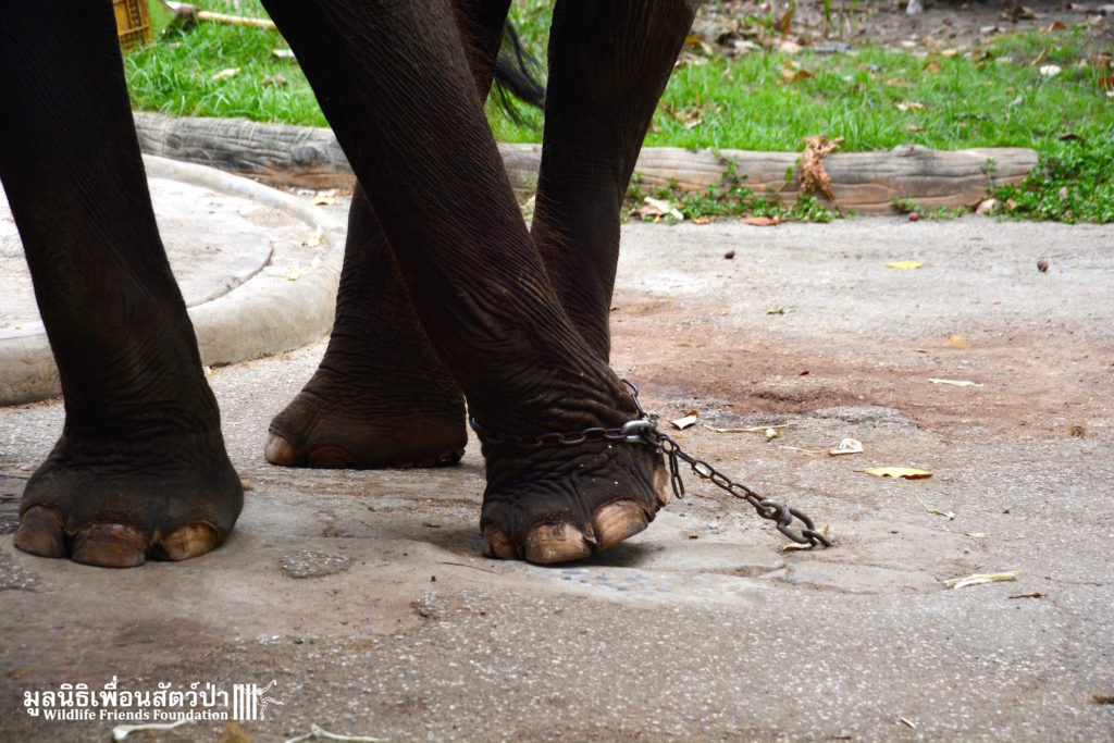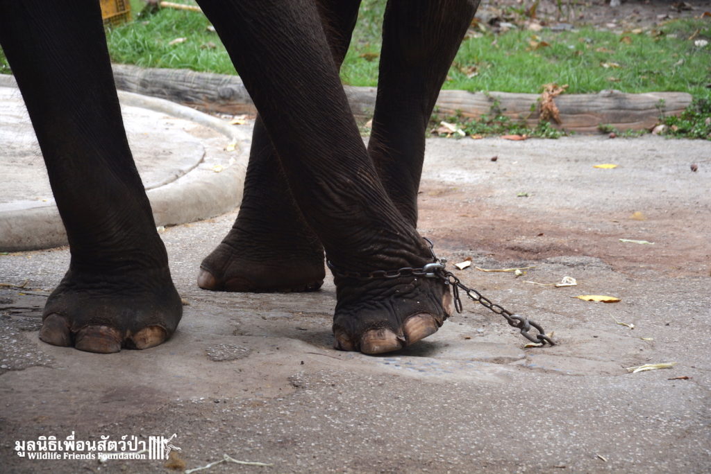 WFFT is in discussion with the Animal Welfare Division of the livestock department and we have been informed that the elephants are being checked regularly by veterinarians and receiving the correct veterinary treatment. Many people have asked about Gluay Horn’s broken leg. He does not have a broken leg – when the picture was taken it was swollen from pulling away from the chain. His leg has now been treated by a veterinarian and is in a far better condition.