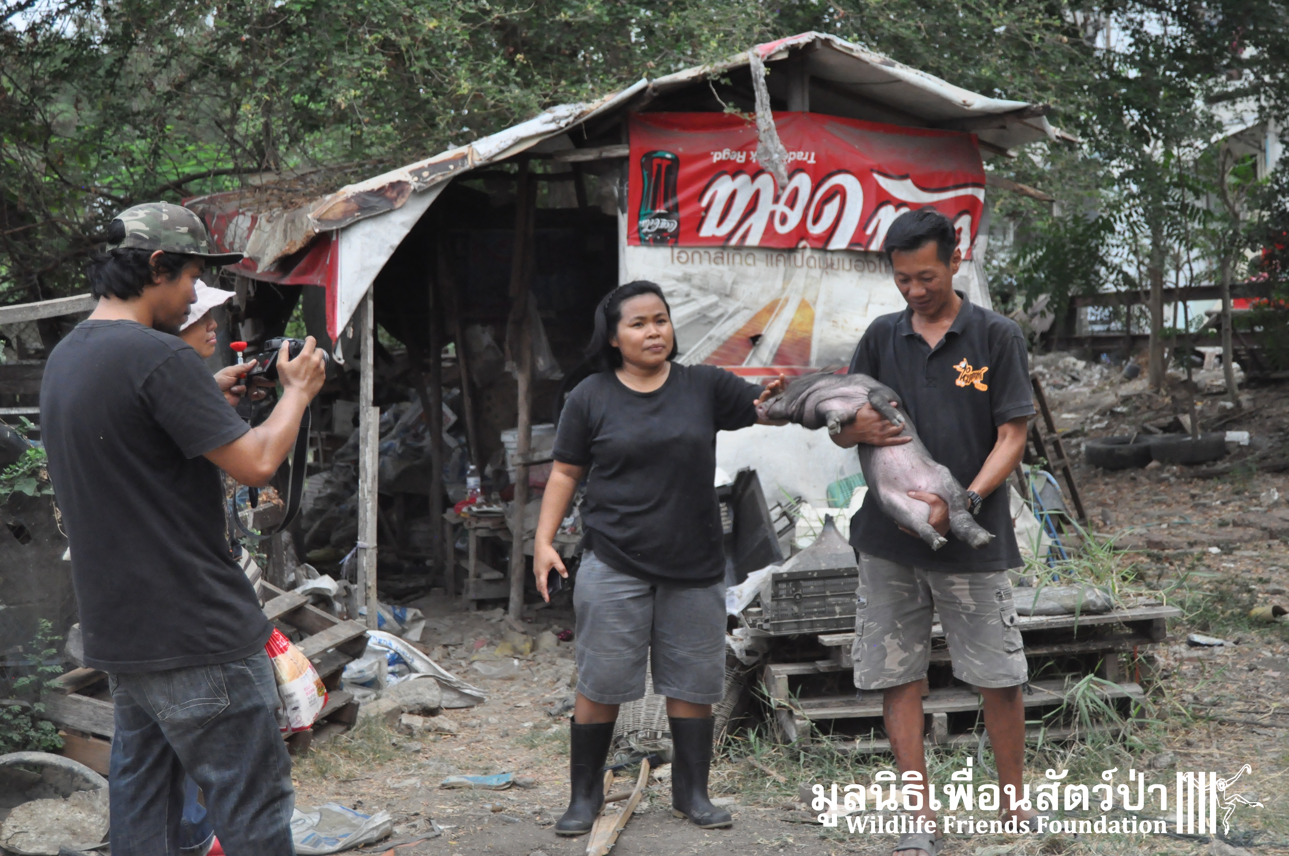 Yesterday the WFFT Rescue Team headed north to Bangkok on a mission to rescue a group of 9 Eurasian wild pigs (Sus scrofa) that were marooned on a piece of waste land surrounded by heavily populated urban settlements. We were alerted to the plight of these poor animals by TV personality Kittipong Khamsat from หมากาพย์ หมาจร and a long-term supporter of WFFT, Tossaporn Klunkaew. They had all originated from two individuals that had been released into an enclosed grassland area some years ago. As the years went by these pigs were under more and more pressure from urban expansion and poaching by hunters for food. This family off pigs had been at the site for many years without appropriate food or access to clean drinking water. Over the years they have managed to survive by being fed household food waste from kindhearted locals. Upon arrival to the site the WFFT Rescue Team were shocked at some of the clearly visible human caused injuries sustained by many of the pigs, barbaric barbed arrows had been used in an attempt to capture these pigs and eat them. A team of over 15 people spent the whole day rounding up the pigs to bring them back to the WFFT Wildlife Rescue Centre for urgent veterinary treatment and to provide them with a suitable home.
