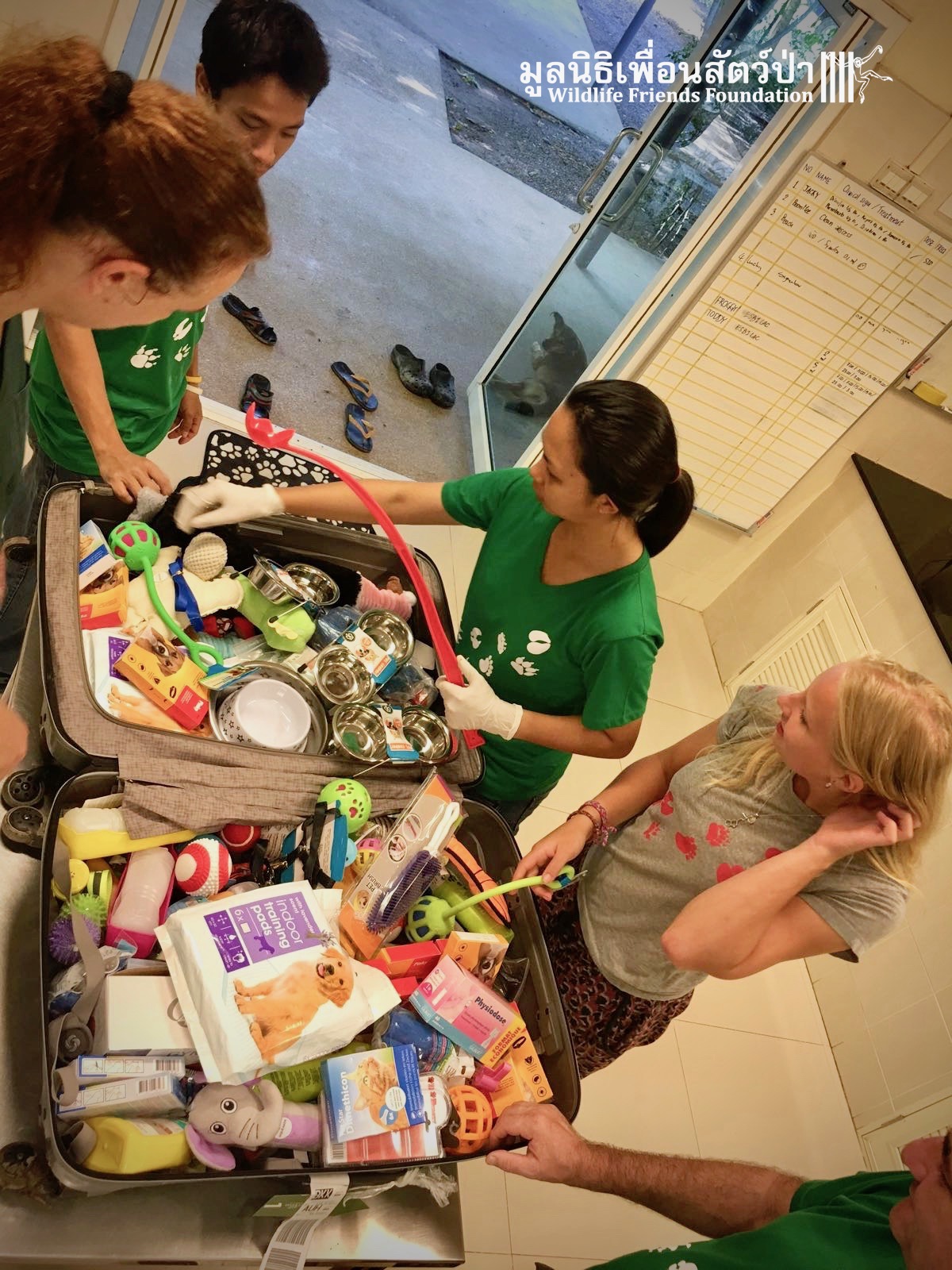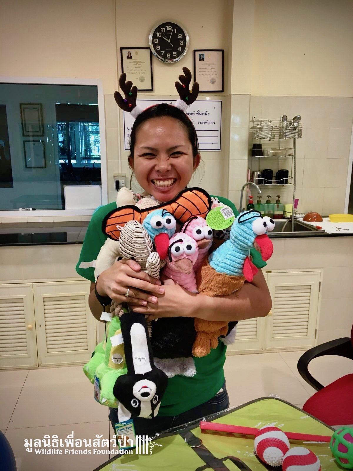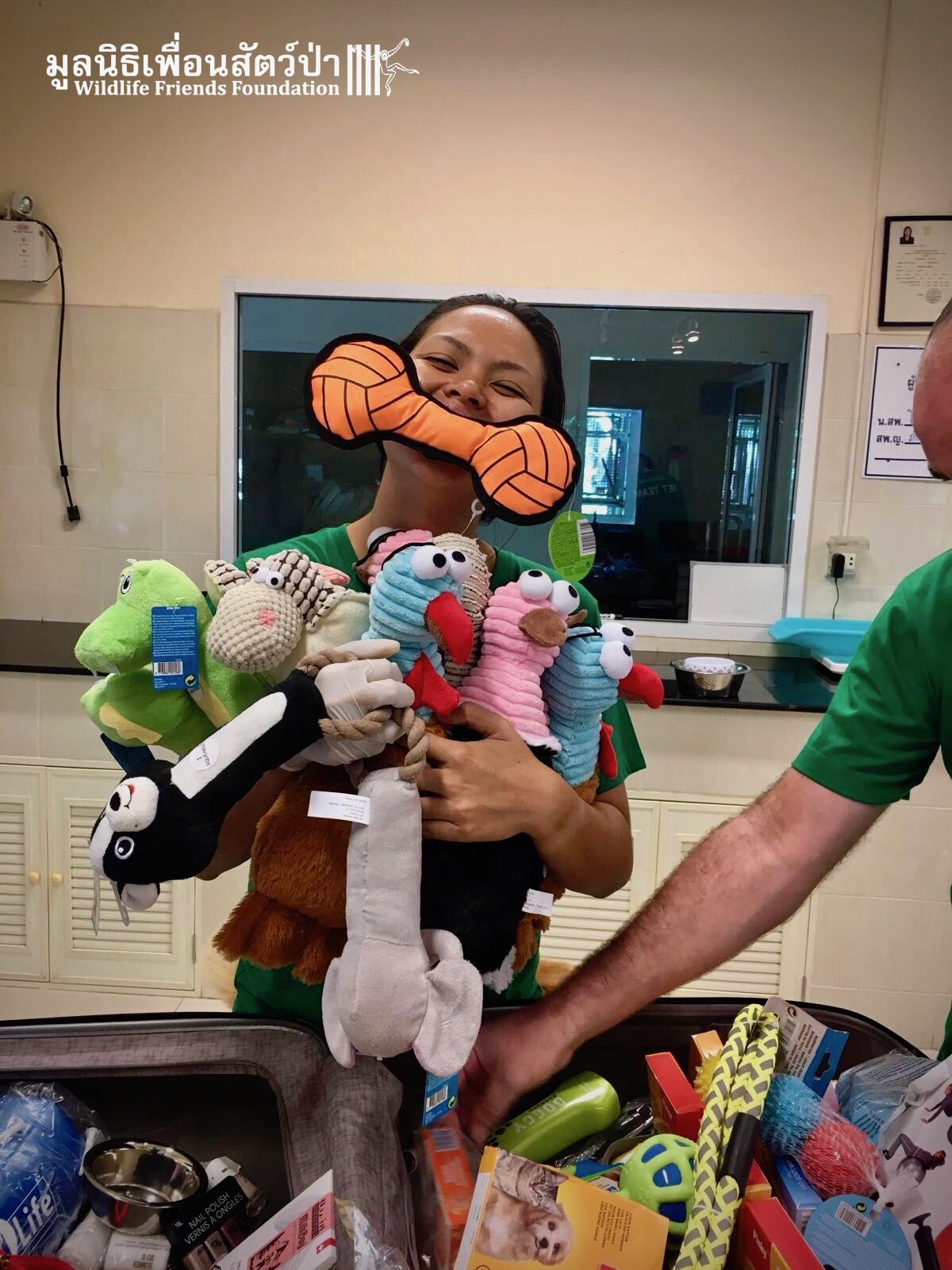 Two French WFFT Wildlife Volunteers brought some wonderful supplies for animals at our wildlife hospital, and also gave a donation. All of us here at WFFT would like to thank them for their kindness and generosity. (As you can see from the pictures WFFT Vet Aon Parkpayukthanathanarkul is a little excited by all the toys….)