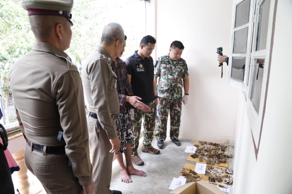 Thai authorities seize clouded leopard carcasses, golden cat and leopard cat skins and other animal parts after a man offered wildlife for sale on Facebook. On 25 March 2019, The Department of National Park (Phaya Seua task force) in cooperation with police and military in Ratchaburi acted upon a tip off and investigated after a Facebook post with photographs of wildlife carcasses and skins for sale, found after obtaining a search-warrant then they found carcasses of protected animals which included 23 clouded leopards pieces of skin, 13 golden cat and 9 leopard cat skins, and 2 muntjac horns. The goods were found at Mr.Adul Martlueng’s (อดุลย์ มาตรเหลือง) house at 388/19 Moo 1 Tha KhoeiSuan, Phueng District, Ratchaburi. Mr.Adul Martlueng has been arrested and is being held awaiting trial at Suan Phung Police Station. We congratulate the Department of National parks with their swift action after receiving the tip-off! Another wildlife trader behind bars, Great work! Original story here: https://www.facebook.com/prhotnews02/posts/1743855139093298